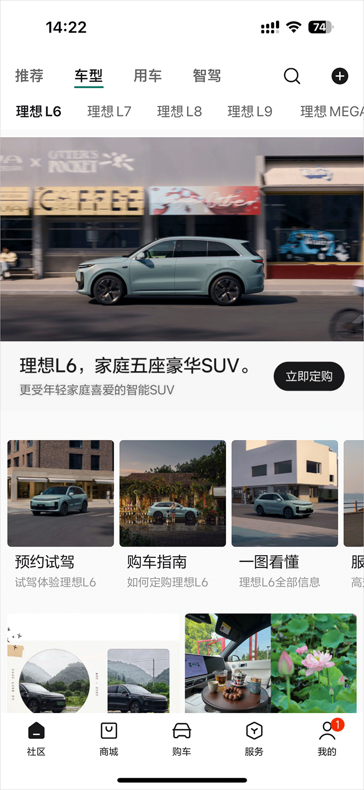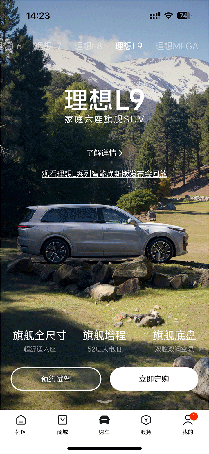 4、购车界面非常的经典,包含了理想汽车当前所在售的所车型,如果有想购车的朋友们,可以在线预约试驾哦。