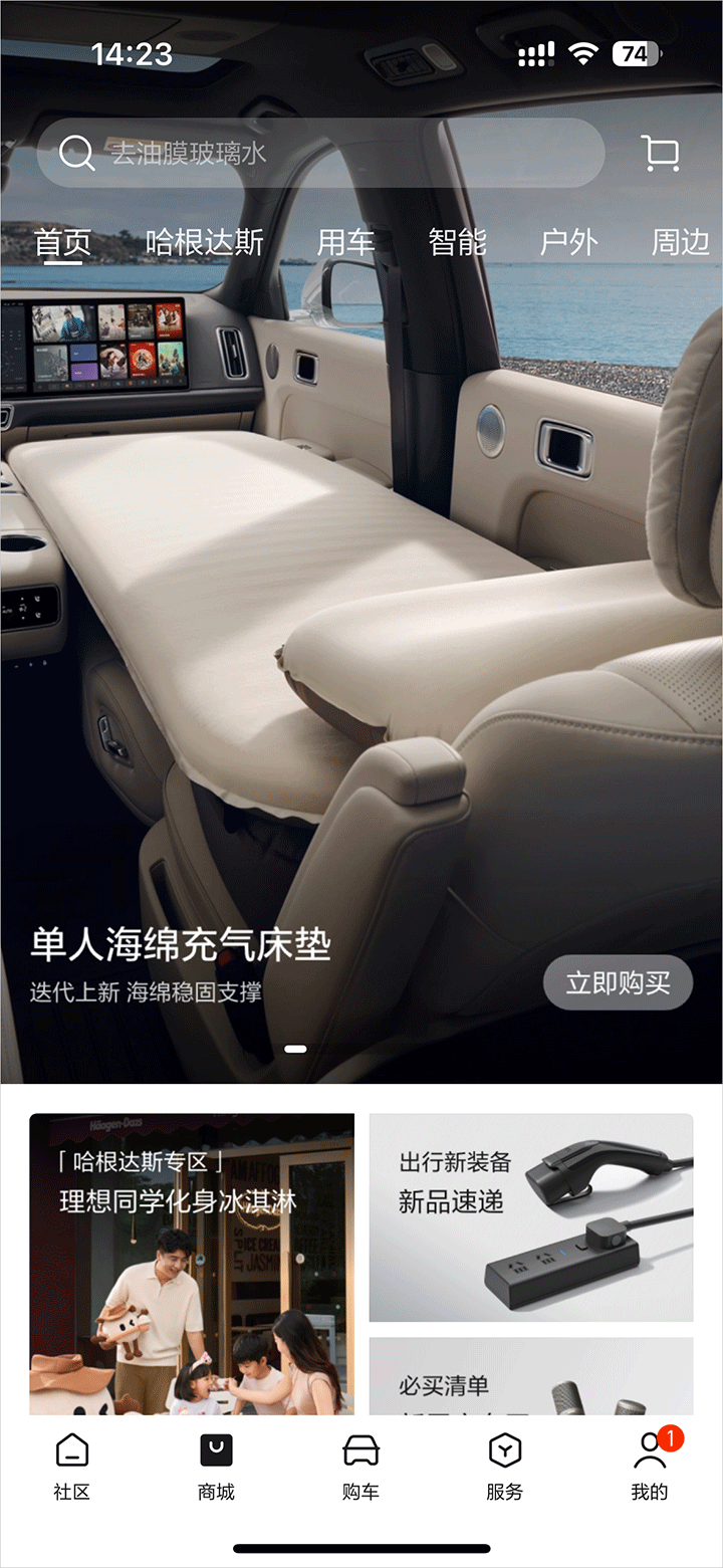 4、商城:可选购车辆精品附件,理想品牌周边等生活好物,让您的用车更轻松。