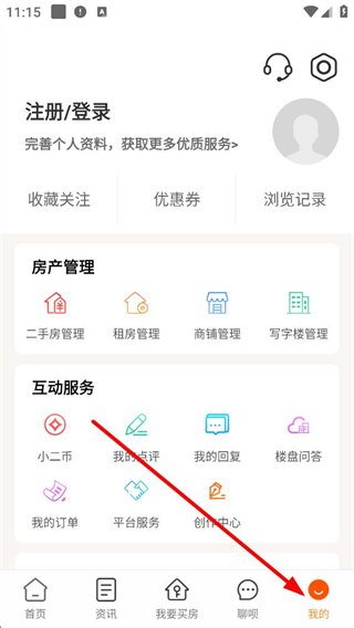 2、个人中心可进行账户注册登录,管理收藏记录与优惠券,参与房产管理与互动服务。