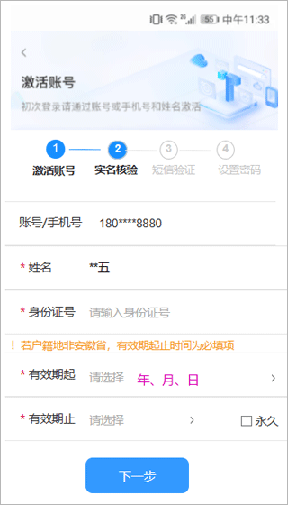 输入账号/手机号和姓名验证账号是否激活,已激活,直接进入登录页,未激活点击下一步