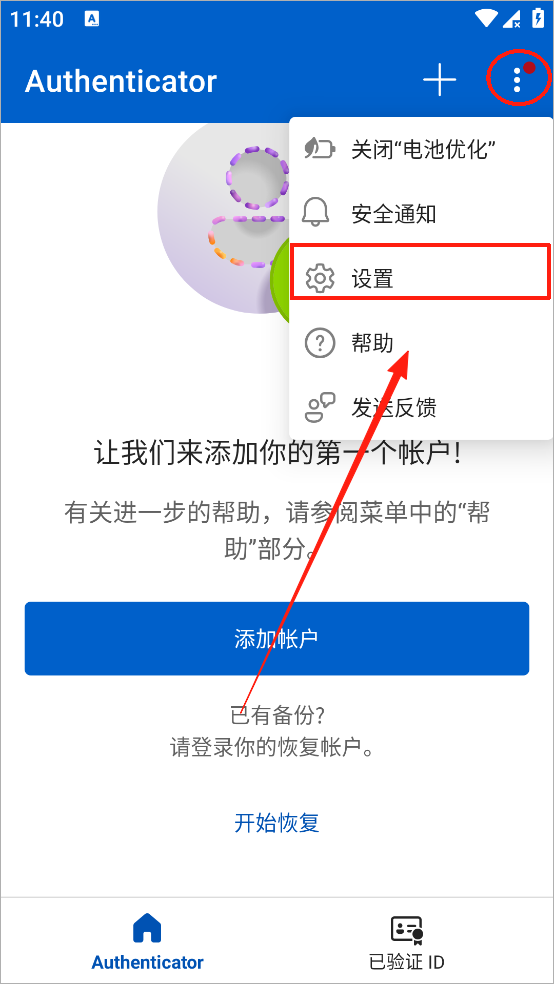 1、打开Microsoft Authenticator点击右上角的三个垂直点,然后点击设置。