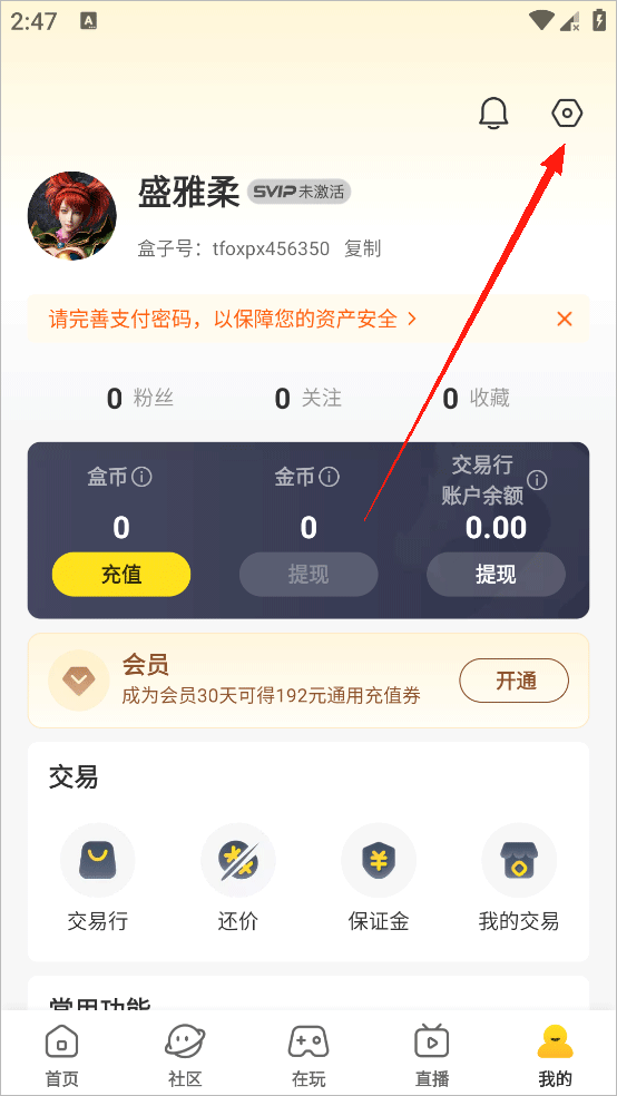 2、在我的页面,点击右上方的小齿轮,进入设置页面