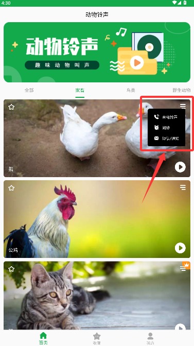 4、通过右上角功能菜单可将喜欢的动物叫声设置为手机来电、闹钟或短信提示音。