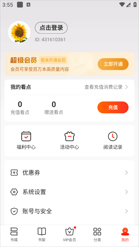 4、在“我的”界面,用户可以登录自己的账号,查看自己的阅读记录以及优惠卡券等等,更有全新活动中心等你来发现。