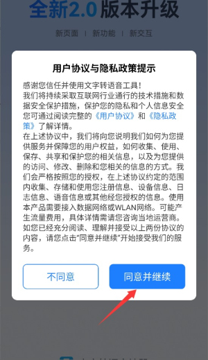 1、首次启动应用时,系统会显示用户协议和隐私政策,阅读后点击同意按钮进入主界面。