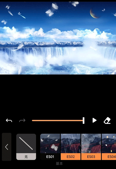 6、然后点击“覆层”,选择图中所示的“ES09”效果,就是加飞舞的蝴蝶,当然也可以加别的特效,好了点击右上角“导出”按钮。