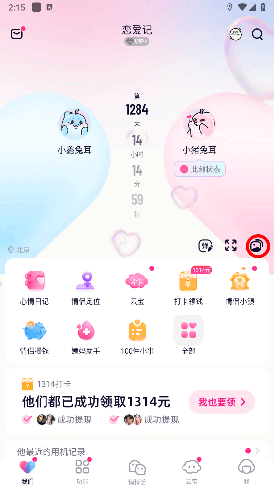 1、打开恋爱记官方app最新版绑定情侣账号进入首页点击相册图标