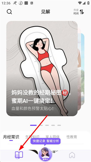 1、见解板块提供经期秘密等科普内容,涵盖月经常识与生理知识等分类信息。