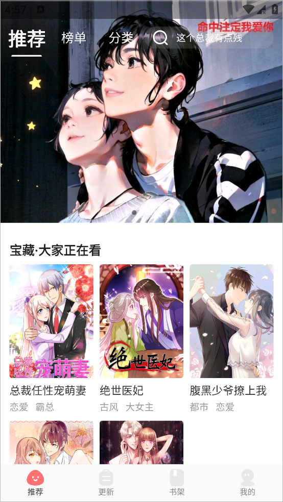 1、打开app首页会有推荐的热门漫画,也可以查看榜单和分类