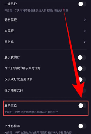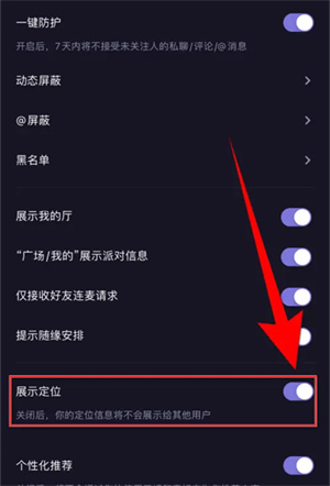 4、【展示定位】后面的圆点变为灰色即表示朵朵开黑设置展示定位停用成功。