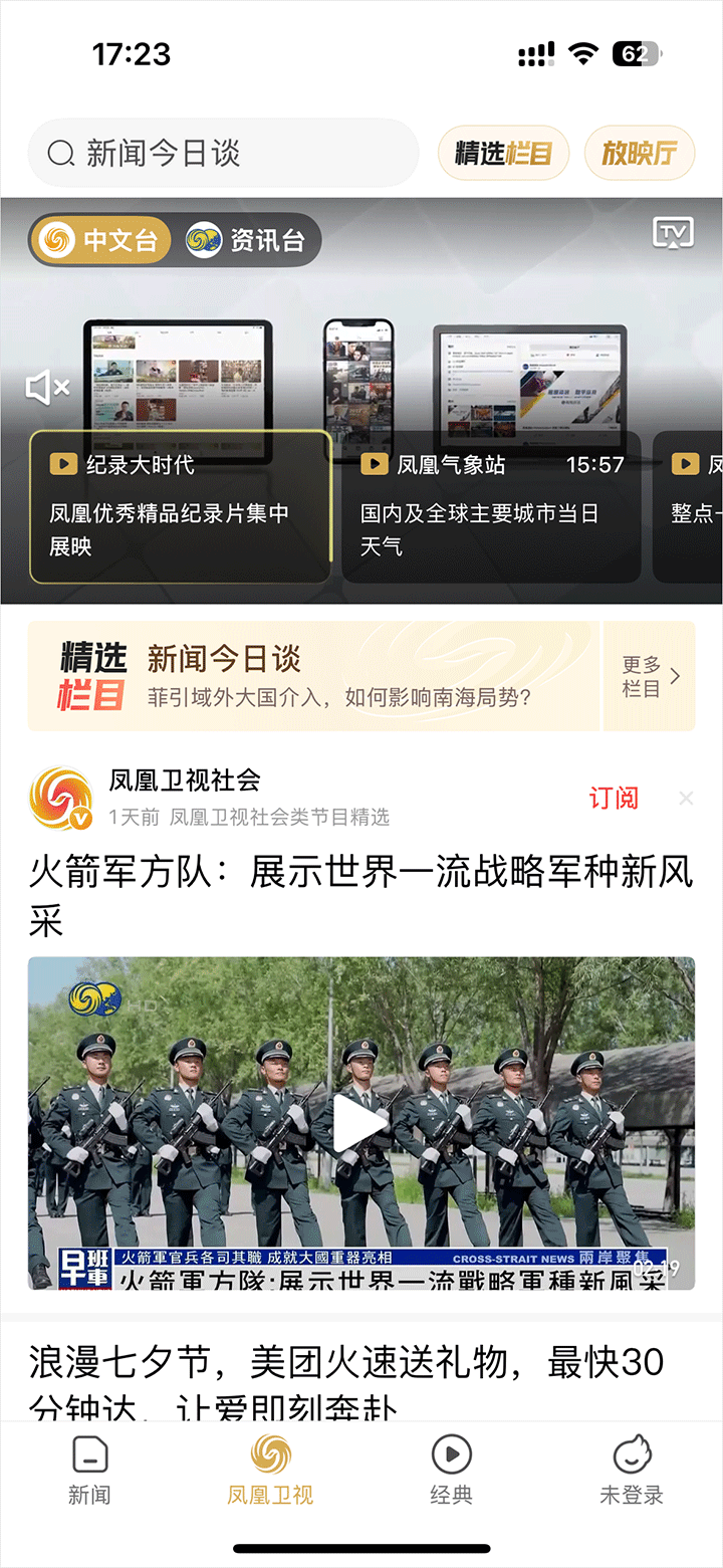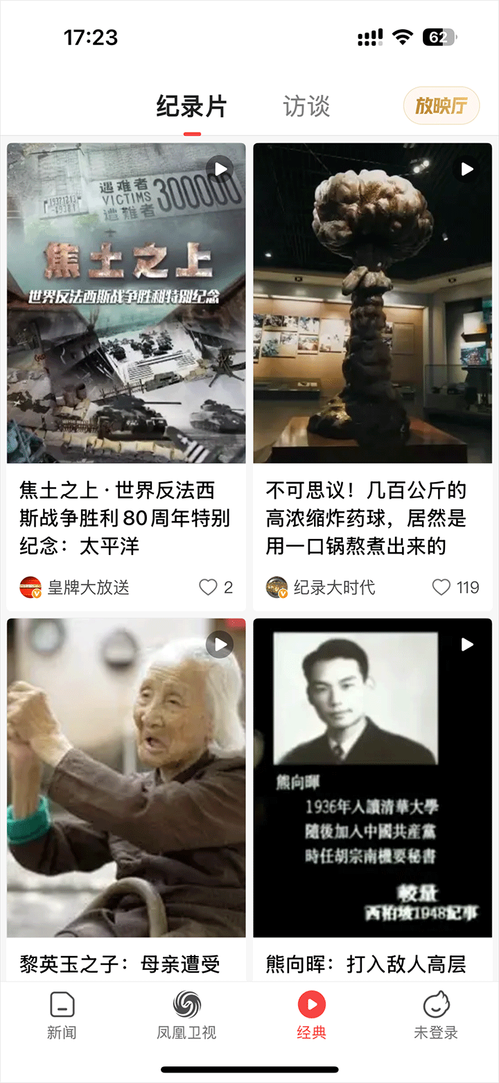 极具凤凰调性的经典节目,伴随全球华人成长的原创精品,遍及全球名人、政要的人物访谈,独家放送的纪录片大作……都在这里,就在这里。