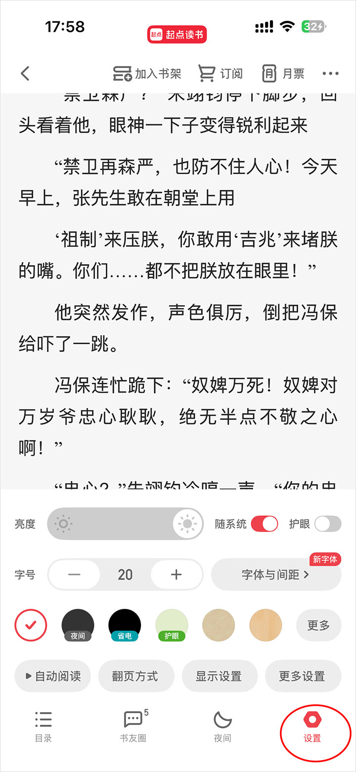 6、点击底部“设置”,还支持设置护眼模式、自动阅读、横屏模式、字体、背景等。