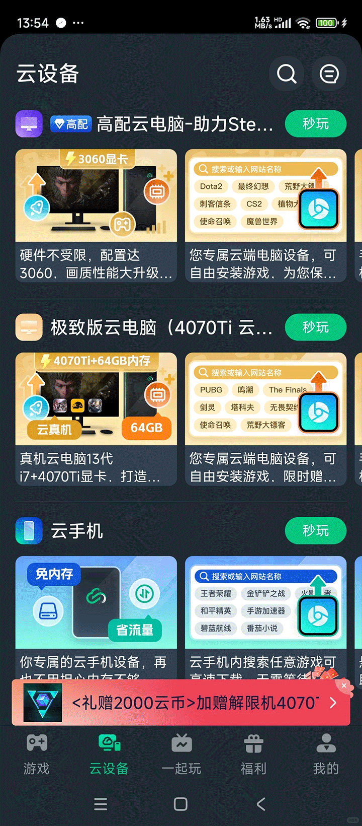3、海量云设备,配置碾压!高配云电脑、极致版云电脑、云手机任你选随便用,硬件不够云来凑!就算手机/电脑配置一般,也能流畅玩3A大作,画质拉满,爽到飞起