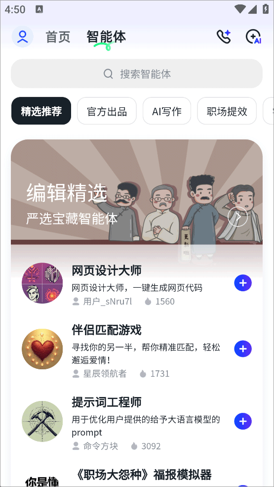 2、【智能体】首页左滑智能体界面有更多的实用工具,都可以免费使用,不管是学习方面还是职场方面