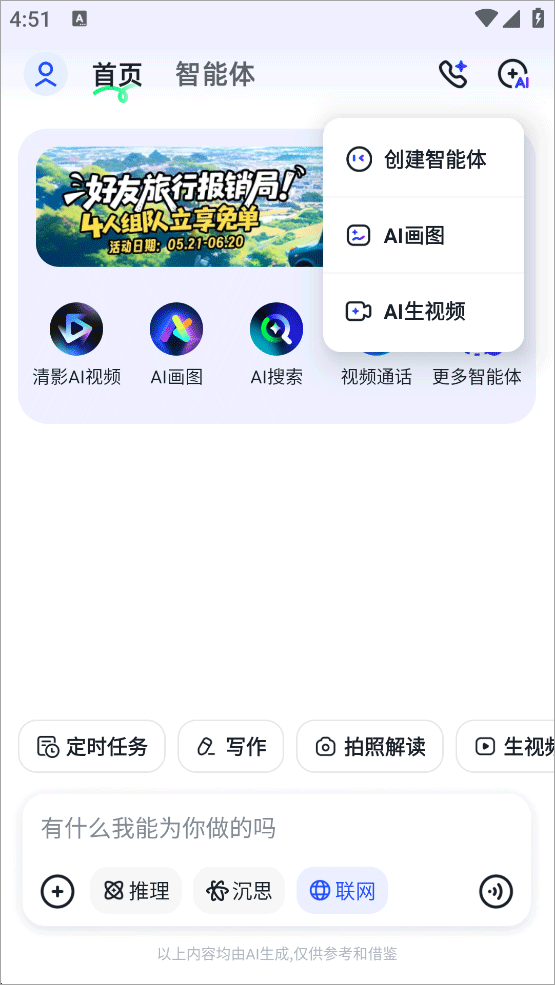 4、首页除聊天功能以外,点击右上角的加号可以一键ai生成画图以及视频