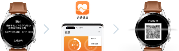 1、首先,扫码配对上滑手表屏幕,进入扫码配对界面;手机打开华为运动健康App的设备页面,点击扫一扫,用手机扫描手表屏幕上的二维码。