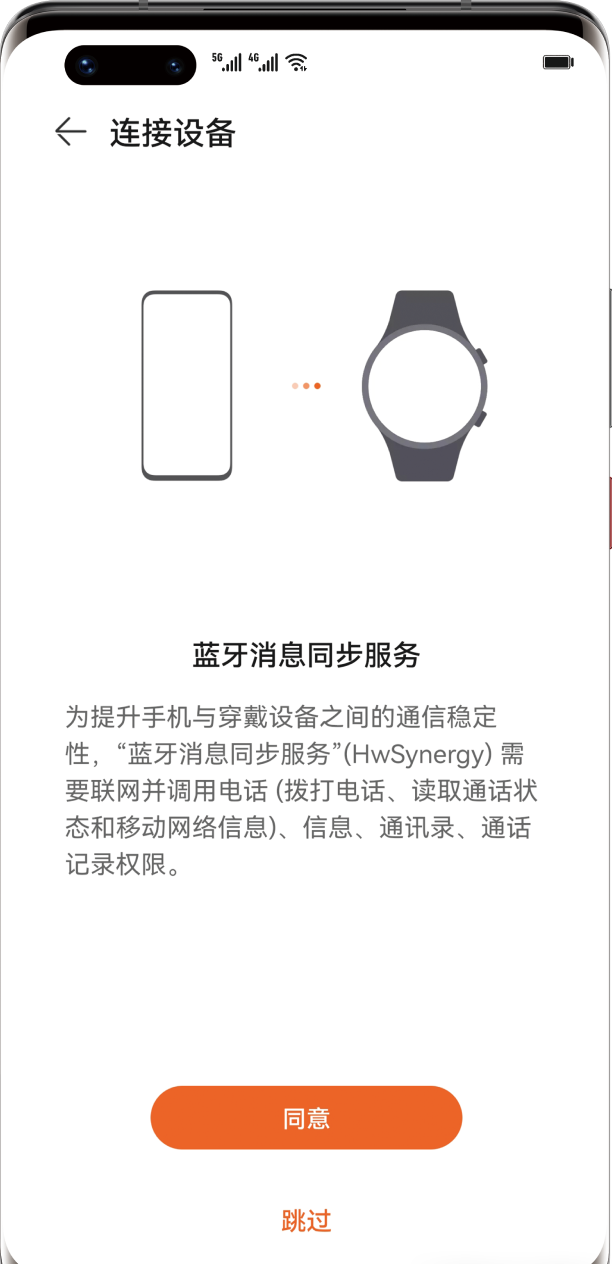 2、同步蓝牙消息扫描成功后,点击确定连接。手机同步设备信息后,进入蓝牙消息同步服务界面,点击同意,开始配对。