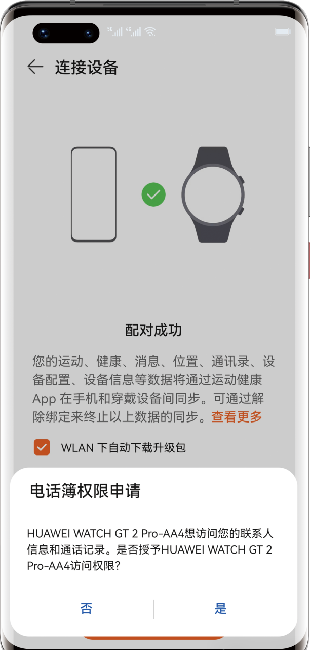 3、当手表屏幕上出现配对请求时,点击确认配对。手表端确认配对后,手机界面会弹出电话簿权限申请。 你可以根据自身情况,选择是或否;点击完成,即可配对手表与手机。