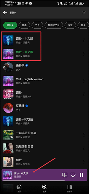 2、搜索结果出来后点击你收听的歌曲,播放后点击下方的歌曲进入播放界面;