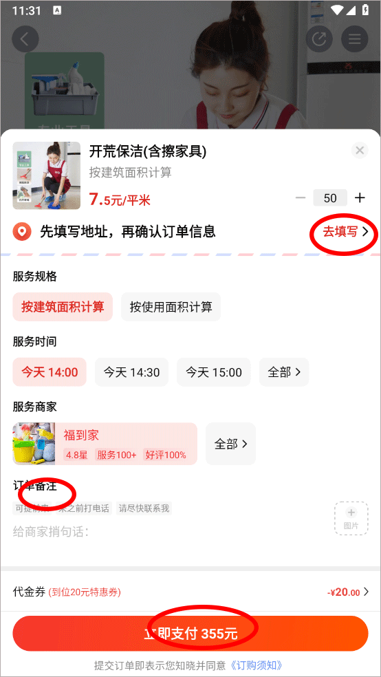 5、先填写上门地址,选择合适的时间上门服务,如有需求可添加备注等点击立即支付即可预约成功