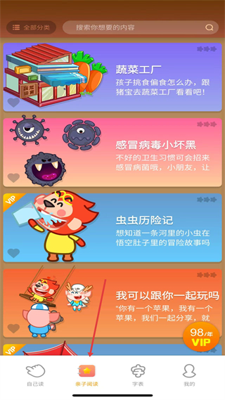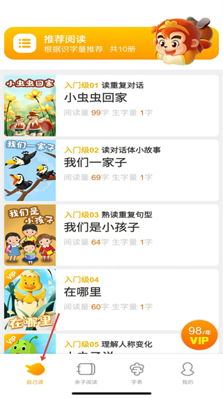 1、自己读板块根据识字水平推荐分级读物,通过匹配能力的内容培养独立阅读信心。