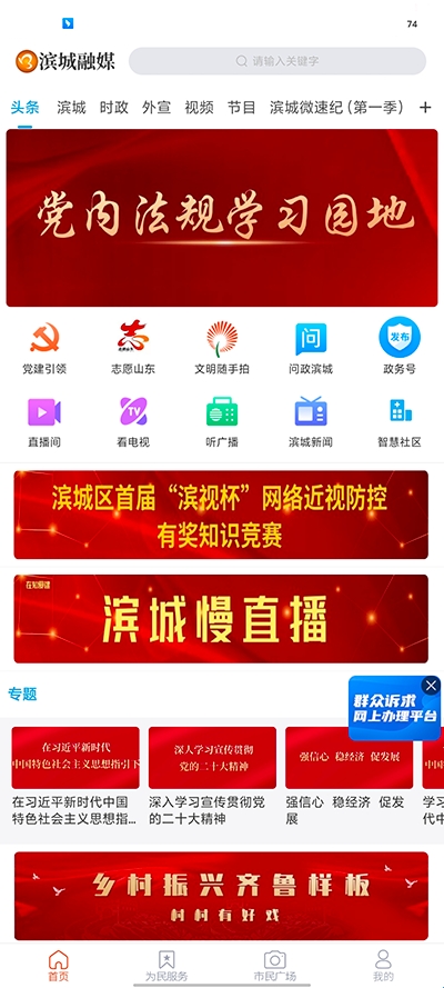 3、滨城区官方最具权威性的移动政务融媒体平台,点播、互动、头条资讯等多功能为一体。