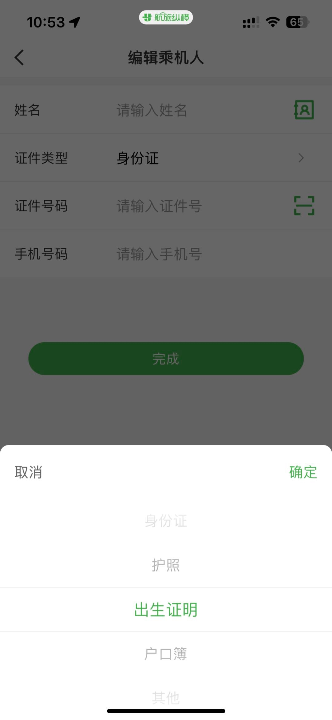5、输入亲友的姓名、证件号码等信息,然后点击“完成”。