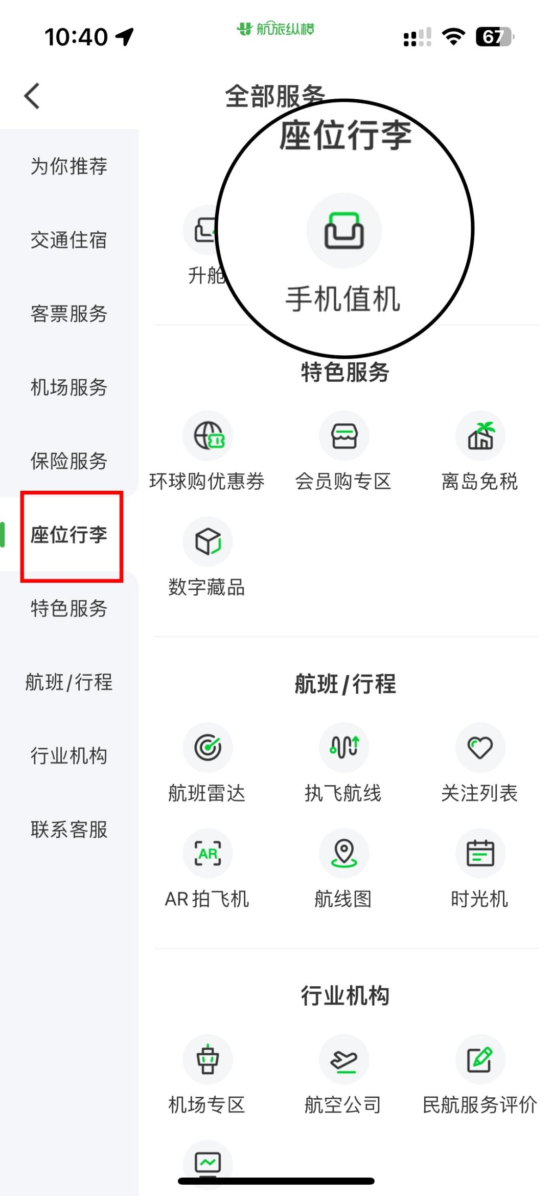 3、在全部服务中的“座位行李”里找到右上方的“手机值机”。