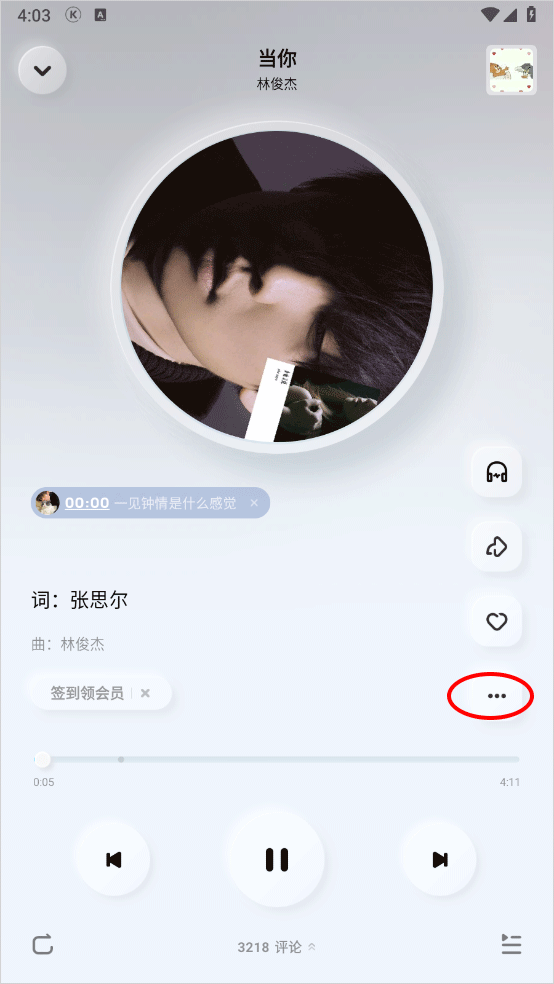 2、进入歌曲播放界面点击右侧色三点图标