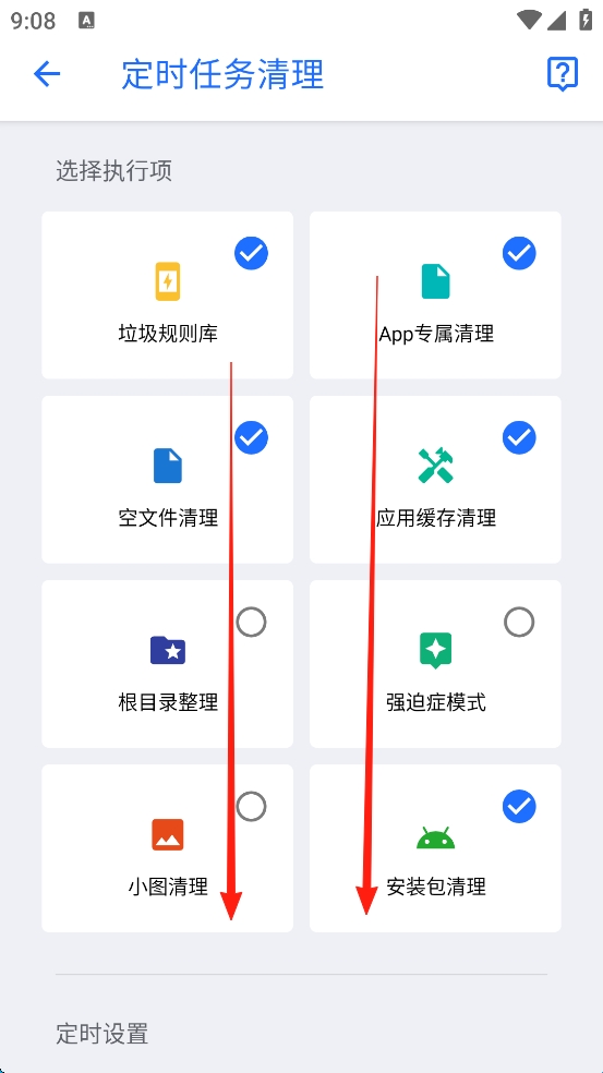 3、可以在此处选择定时执行项,然后向下滑动,找到“定时设置”板块。