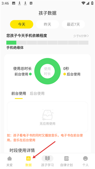 2、数据页面详细统计子女手机使用时长与依赖程度,支持分时段查看应用记录。