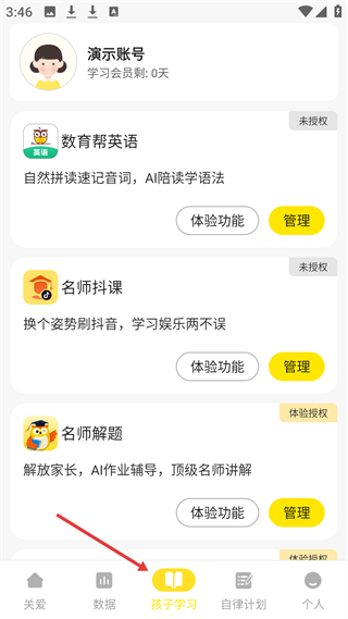 3、学习管理页面汇集数育帮英语等教育应用,支持功能体验与使用权限设置。