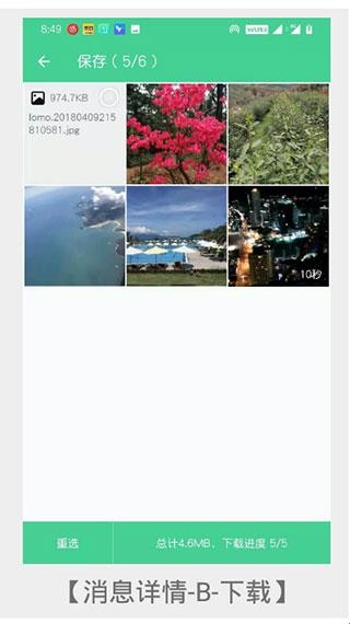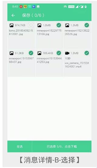6、B手机收到消息后,需要点击消息进入【消息详情】,选择需要保存的数据来下载保存。