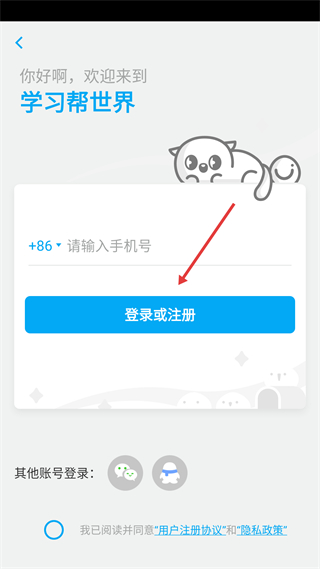1、登录界面支持手机号与第三方账号登录,需确认用户协议后进入学习平台。