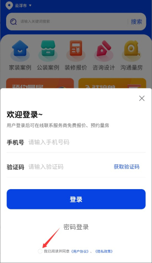 3、在登录界面仔细阅读并勾选同意相关服务条款,进入手机验证流程。