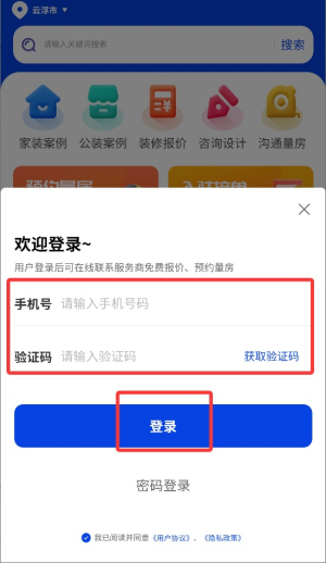 4、输入本人有效的手机号码获取短信验证码,填写正确后即可成功登录装修平台。