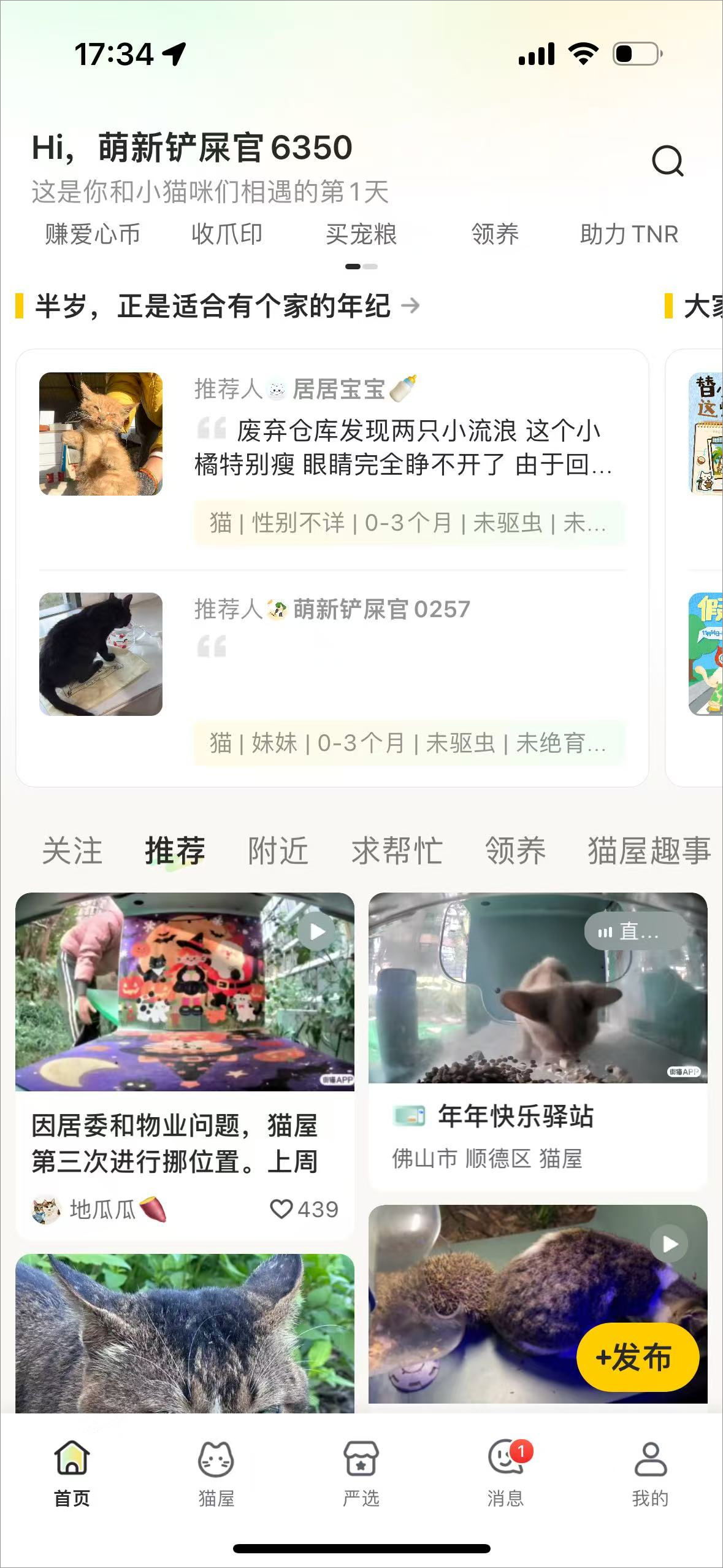 4、首页下滑可以看到各种流浪猫的状况和图片可以和发帖人进行沟通联系收养流浪猫