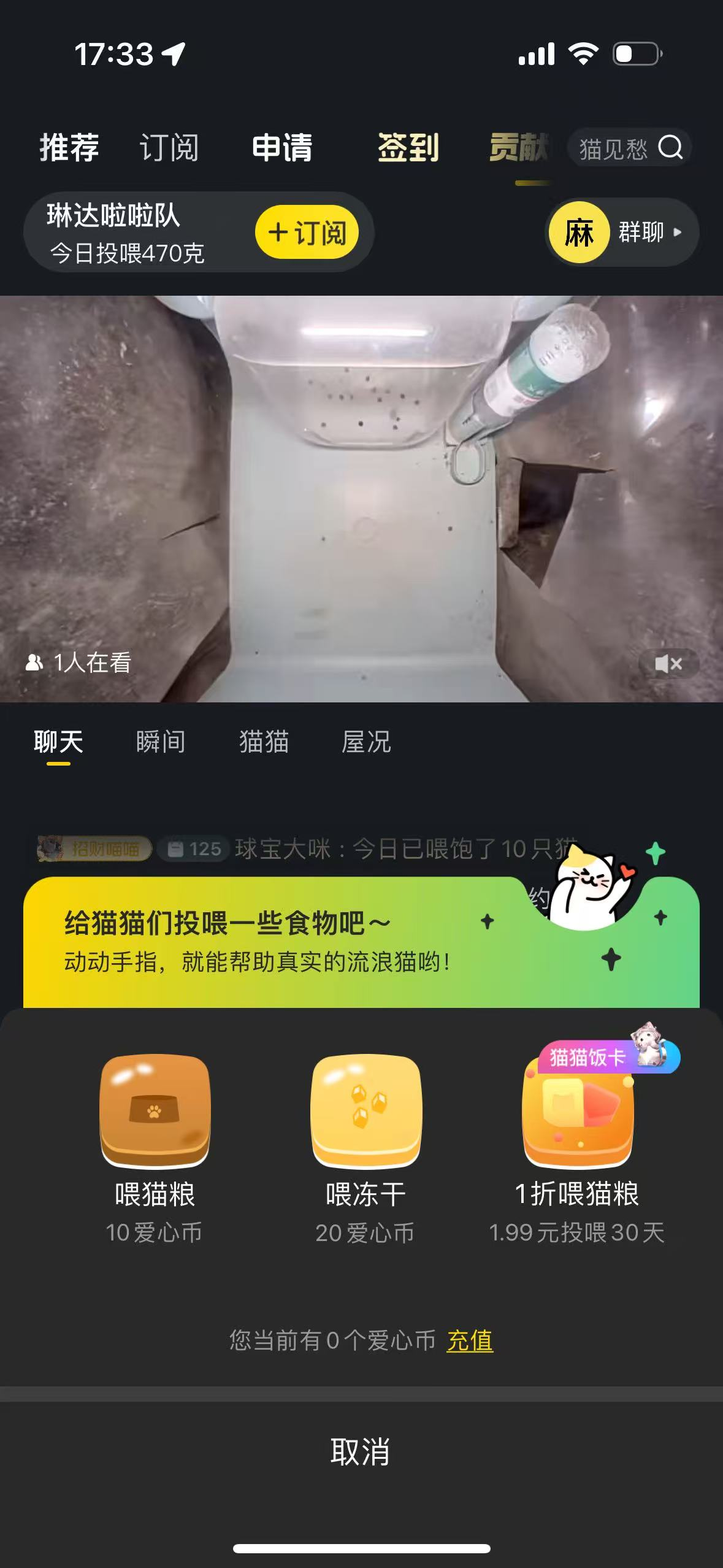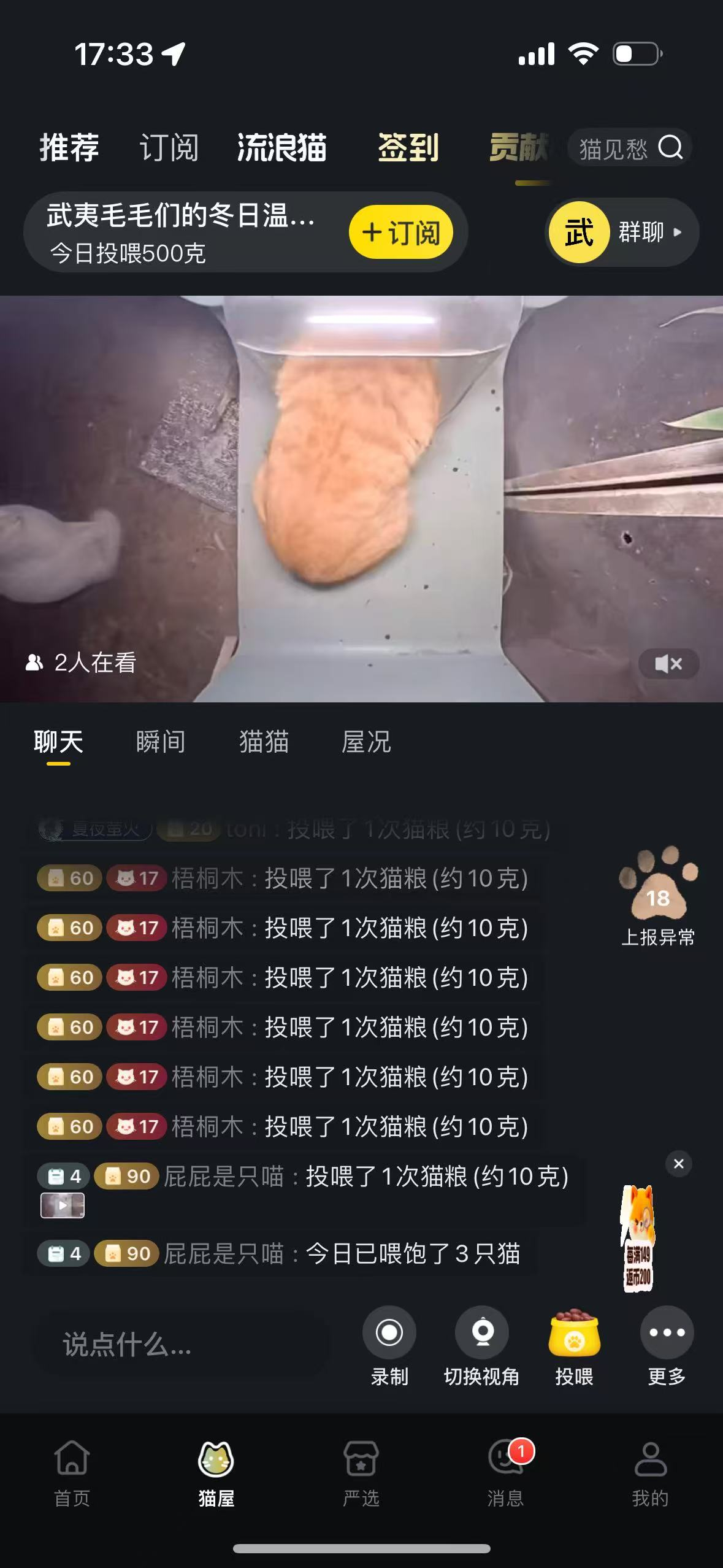 2、在直播间内点击右下角的投喂,可以给猫屋添加猫粮