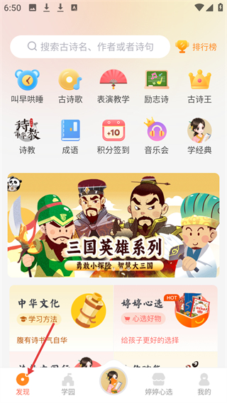 1、发现页面提供古诗检索与叫早哄睡等功能,包含三国系列等传统文化学习内容。