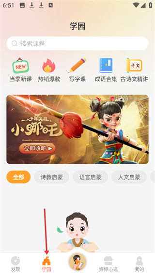 2、学园页面按季节推送新课与热门课程,覆盖诗教启蒙与语言训练等教学类型。