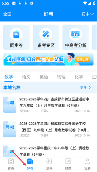 2、好卷专区包含同步练习与备考资源,收录各地名校月考试卷供对比学习。