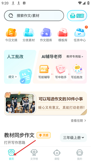 1、首页提供作文素材检索与投稿通道,配备人工批改及AI智能辅导服务功能。
