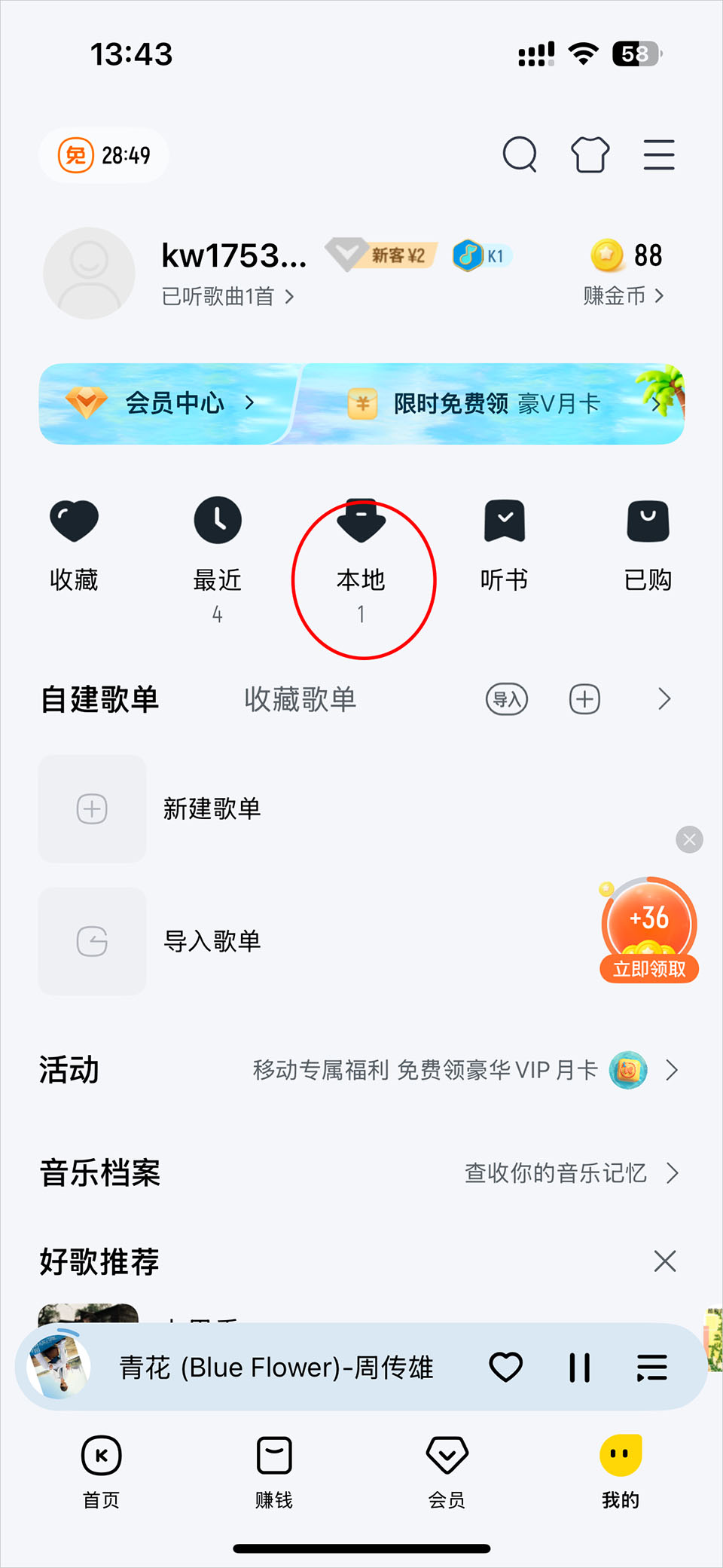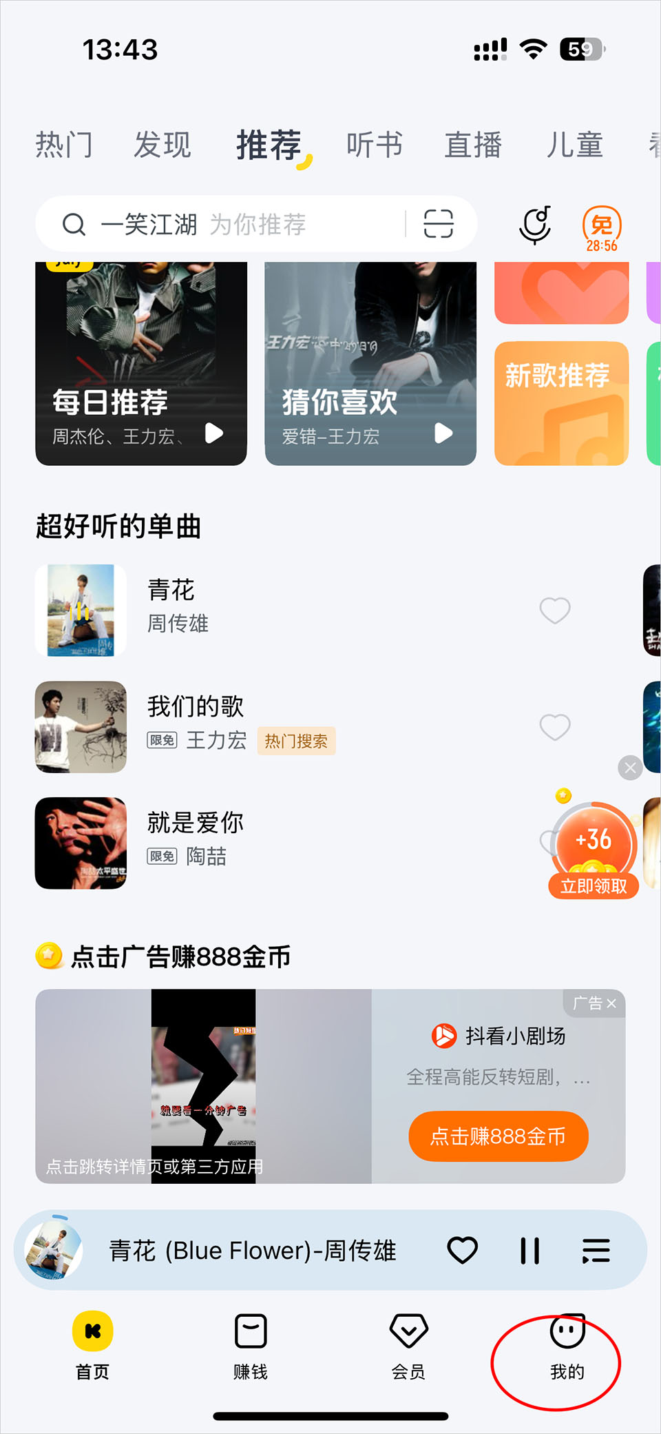 2、歌曲下载完成后,回到首页点击【我的】;