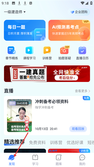 1、发现页面提供每日一题与AI考点预测功能,包含章节精炼及直播课程推荐。
