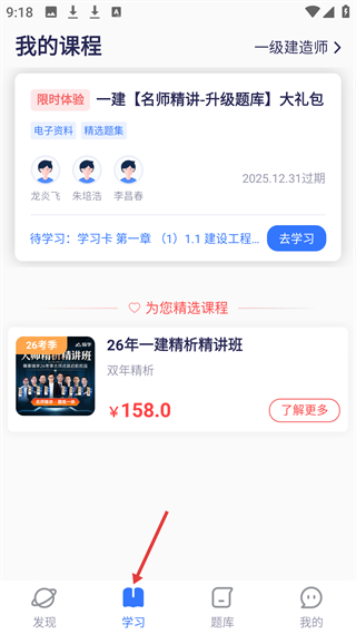 2、学习页面展示名师精讲课程资源,设有一建备考等限时体验与系统培训班级。