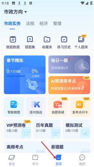 3、题库页面按专业科目分类,配备章节练习与智能刷题等辅助学习训练工具。