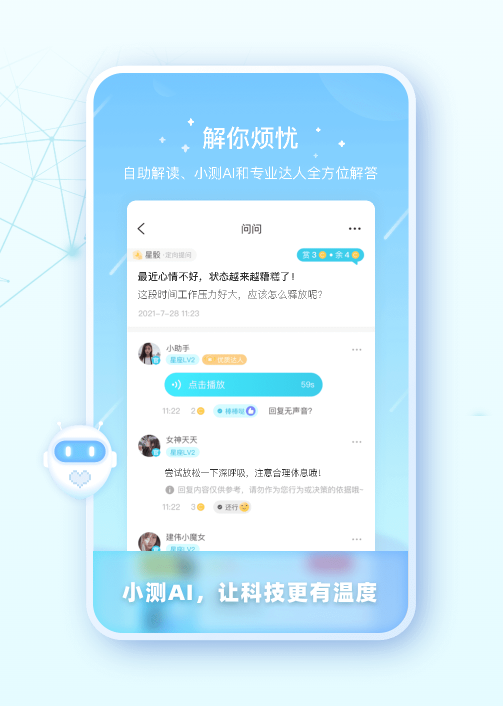 测测APP通过AI和在线人工相结合为3200万用户提供服务,构建全闭环、高频率实时互动的泛心理社区服务场景。