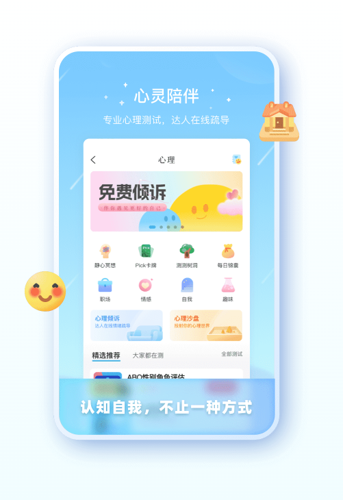 3D心理沙盘、心理测试、每日锦囊等,众多心理模块等你来选。很有趣、更治愈!