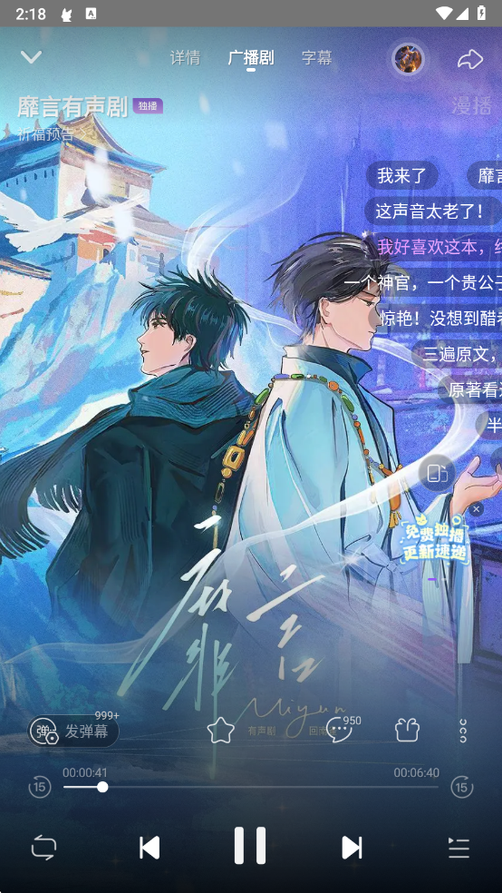 打破传统收听模式,全新的“漫播剧”待你解锁!在同样的时长里享受更丰富的2265视觉体验!原来声音还可以被“看见”,听剧还能这样玩!
