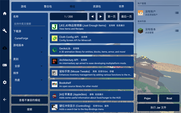 2、同样的就是模组下载,支持中文英文搜索,可以按下载源,游戏版本,类别等等进行挑选。